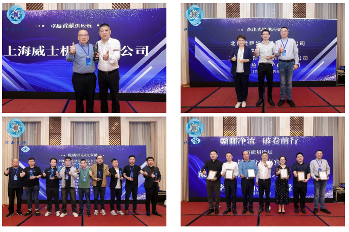 随后举行了颁奖仪式,分别为新当选的副会长单位、秘书长单位以及理事单位授牌,为供应链合作单位授牌,并为圆桌会议参与者及江西省洗涤行业职业技能竞赛获奖选手颁发证书与奖项,现场气氛热烈融洽。