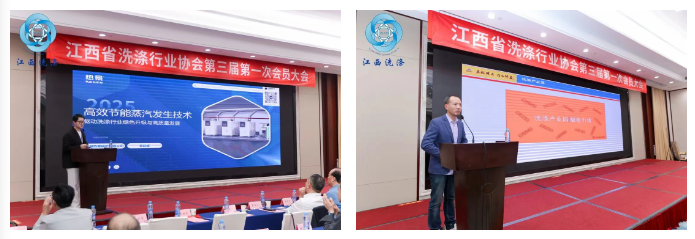 安徽热景锅炉有限公司市场经理袁赵威先生围绕“高效节能蒸汽发生技术驱动洗涤行业绿色升级与高质量发展”,阐述技术创新对行业低碳转型的助力。江西中建建材有限公司董事长胡瀚先生介绍公司建设南昌县洗涤园区的情况,分享区域产业集聚发展经验。