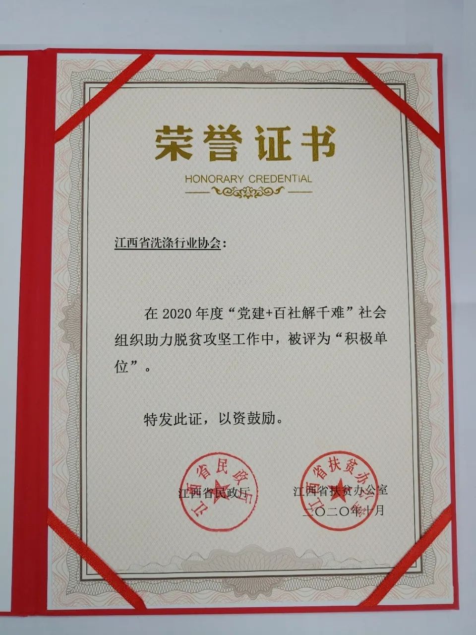 2020年10月15日,江西省洗涤行业协会在由江西省民政厅召开的“党建+百社解千难”社会组织助力脱贫攻坚座谈会上,荣获2020年度“党建+百社解千难”脱贫攻坚“积极单位”荣誉称号!2020年是全国脱贫攻坚的收官之年,协会积极响应党和国家号召助力脱贫攻坚工作,这是一份荣誉,也是一份勉励,同时也感谢江西省洗染行业的同仁们对协会工作的大力支持。协会必将继续努力,不断完善各项工作,更好地服务江西省洗涤行业,助推行业发展。