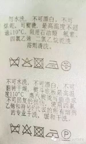 ,标识可以使用四氯乙烯和符号F代表的所有溶剂专业干洗,缓和洗涤,很多洗衣店就使用四氯乙烯进行了缓和洗涤,却发现印花溶解或脱落,难以修复。