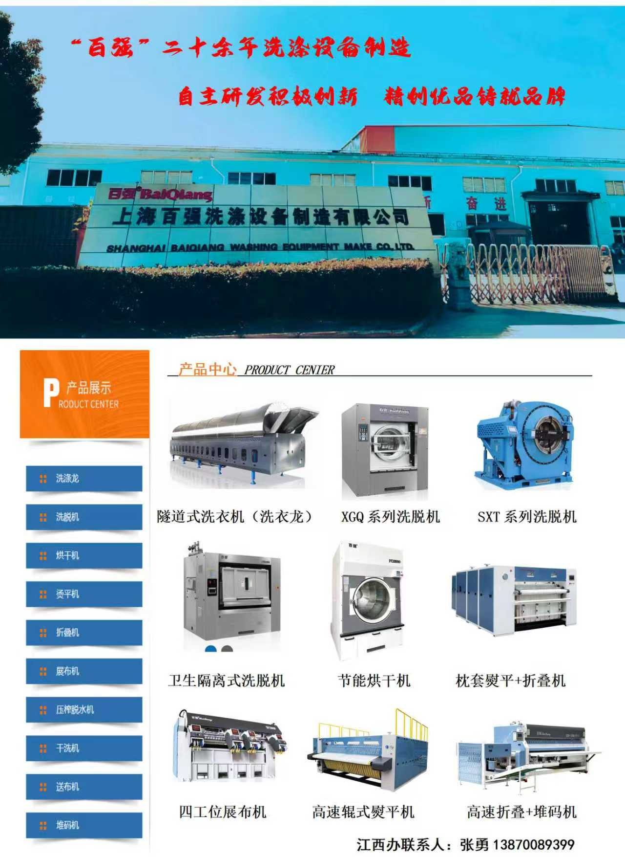 上海百强洗涤设备制造有限公司是一家集研发、制造、销售、服务于一体的洗涤设备制造公司。产品品种有:水洗设备、烘干设备、熨平设备、隧道式洗衣机及相关机组设备、后整理设备等五大系列一百多个规格型号。在中国洗涤设备制造商行业里,一直为从事洗涤行业的客户们提供符合国家或行业相关标准的产品,在国内宾馆酒店系统,医院卫生系统、社会洗涤公司、工矿公司等有着一定的市场销量。